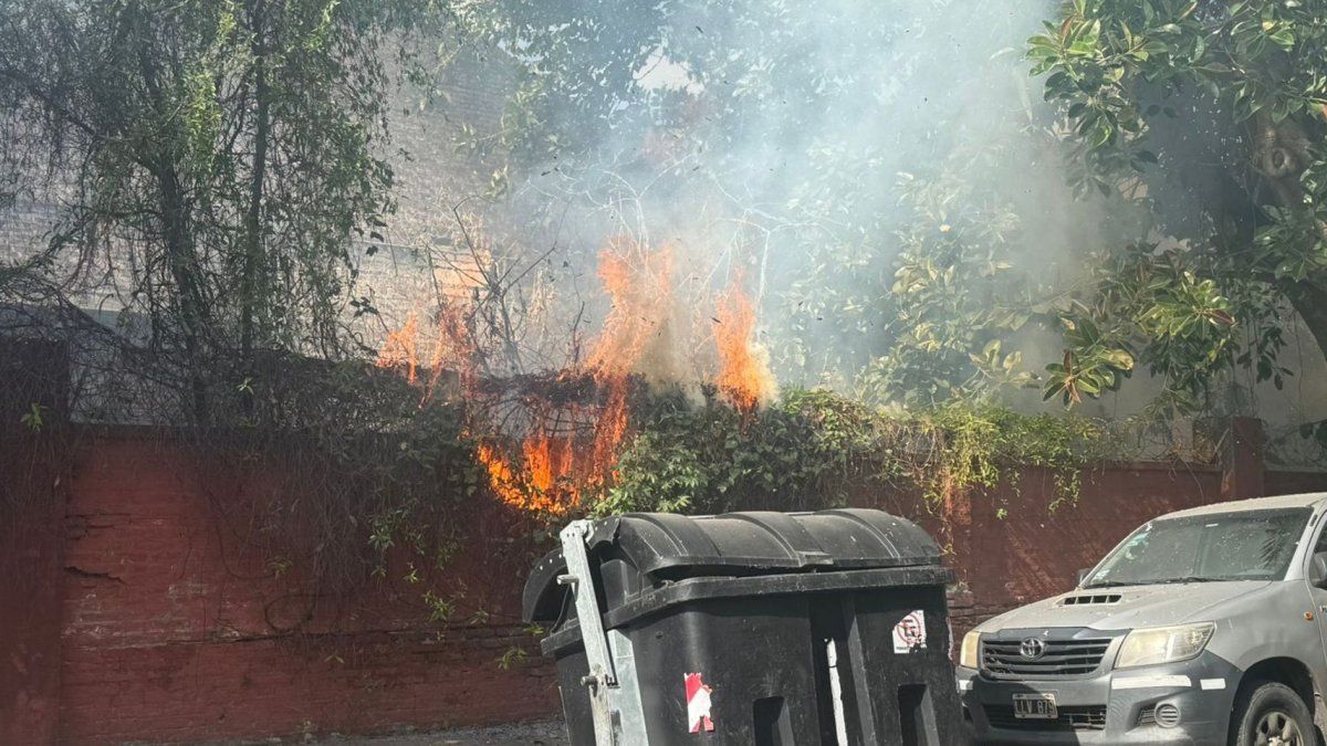 El incendio parecía controlado en el interior, pero la situación se tornó tensa cuando las llamas se reavivaron debido a los pastizales y treparon un paredón hacia la calle, cerca de un tacho de basura y una camioneta que se encontraba estacionada.