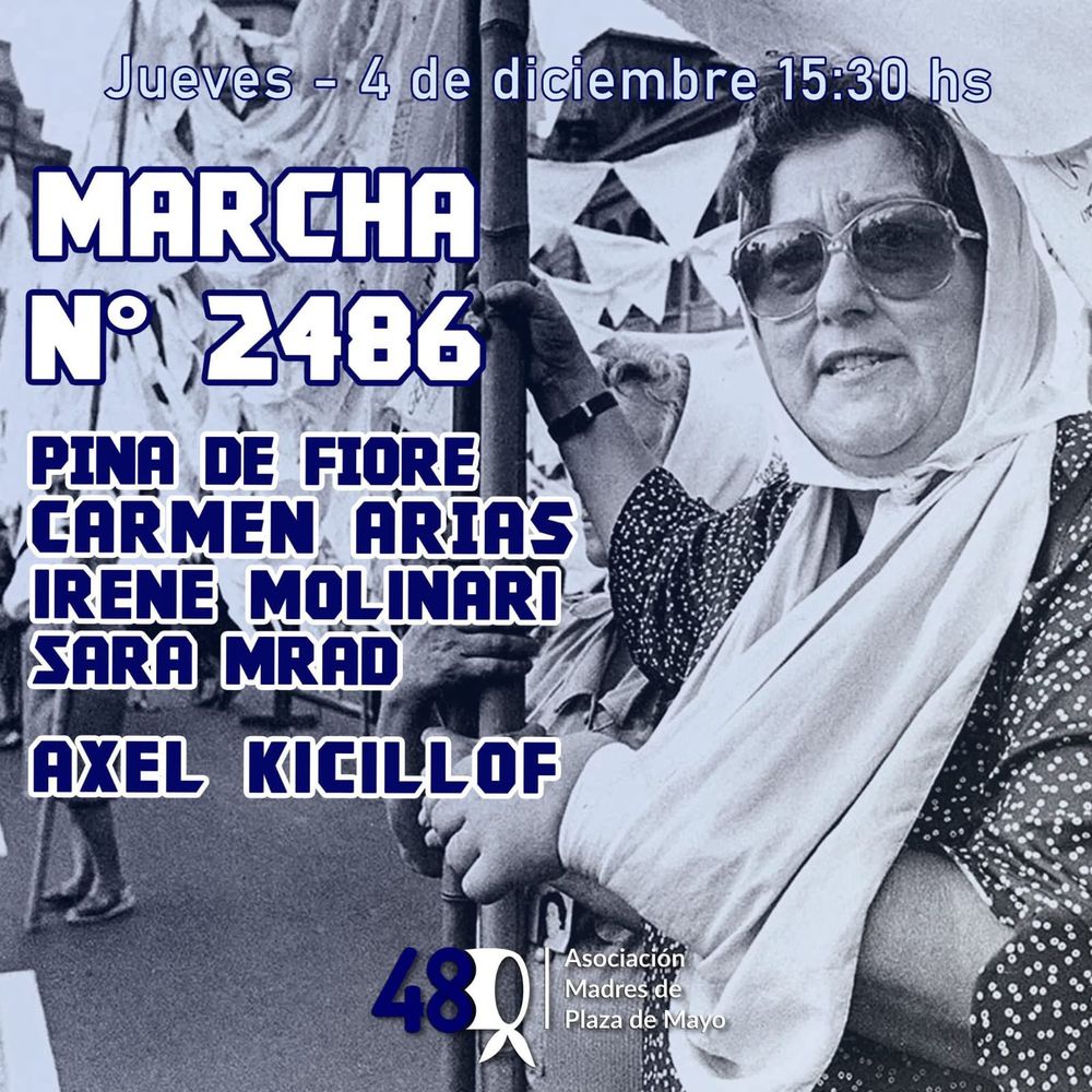 La convocatoria fue anunciada desde las redes oficiales de Madres de Plaza de Mayo. “Este jueves, día de cumpleaños de nuestra eterna compañera Hebe, seguimos luchando en la Marcha de los Jueves, junto a la militancia, Demetrio Iramain y Axel Kicillof”, expresaron, en un mensaje que llamó a la presencia masiva en la Plaza.