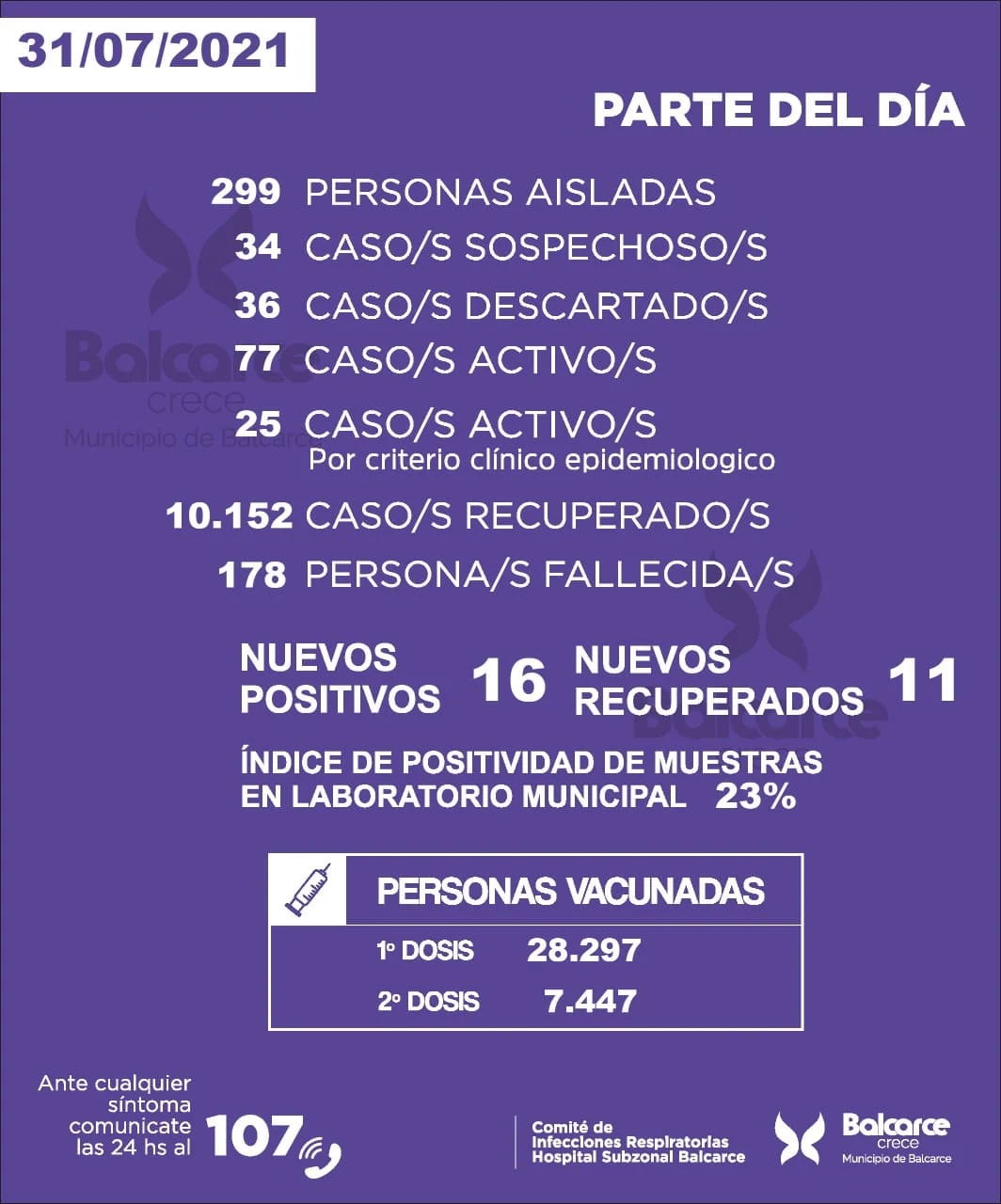 El informe consigna además que 299 personas se encuentran en aislamiento por haber sido contactos estrechos, mientras que a la fecha hay 34 casos en estudio considerados sospechosos, los cuales fueron hisopados y se esperan los resultados para las próximas horas.